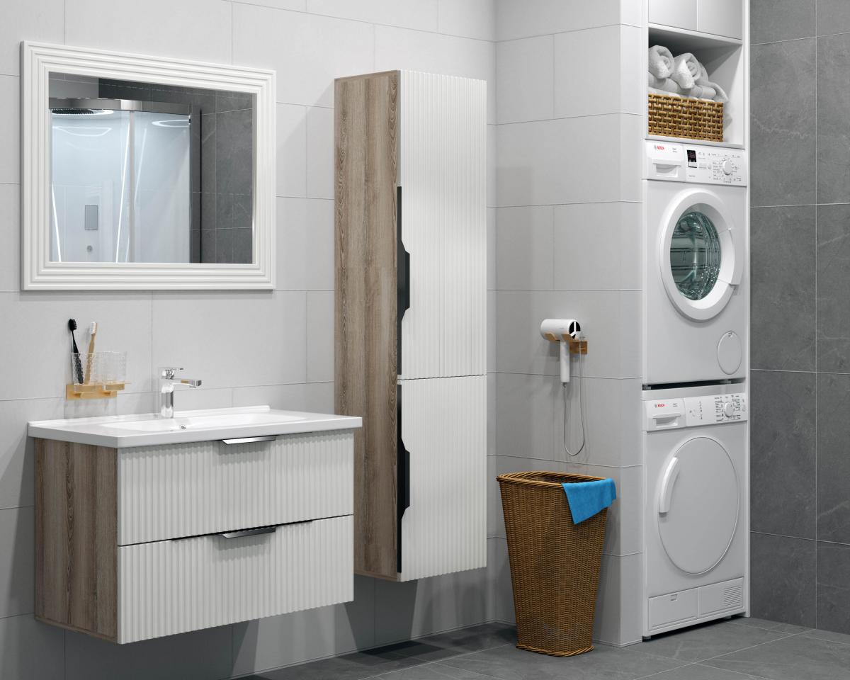 Мебель для ванных комнат из коллекции «Риана» украшена деликатной вертикальной фрезеровкой, которая зрительно вытягивает пространство вокруг. Фрезеровка в сочетании с необыкновенными, удобными и элегантными ручками создает оригинальную дизайн-композицию, которая станет изюминкой вашего интерьера.