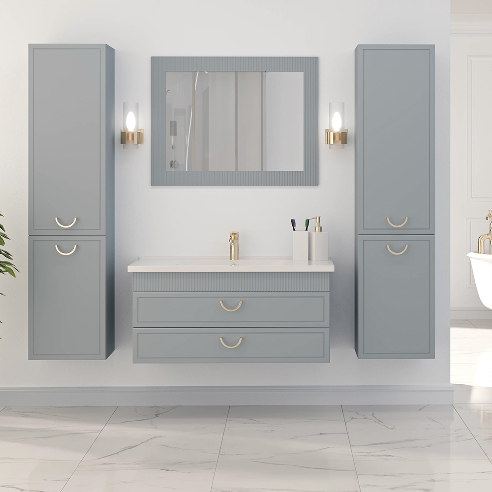 «Лина 2.0» – это выбор для тех, кто ценит эстетику и стремится создать атмосферу утончённого уюта в своей ванной комнате. Фасады украшены изящной фрезеровкой, плавно подчерчивающей контуры и придающей мебели благородный облик. Элегантные арки тумб, дополненные изысканными декоративными элементами, делают коллекцию по-настоящему утончённой. Дополняют этот ансамбль стильные медные ручки, подчёркивающие благородство и изящество дизайна.
