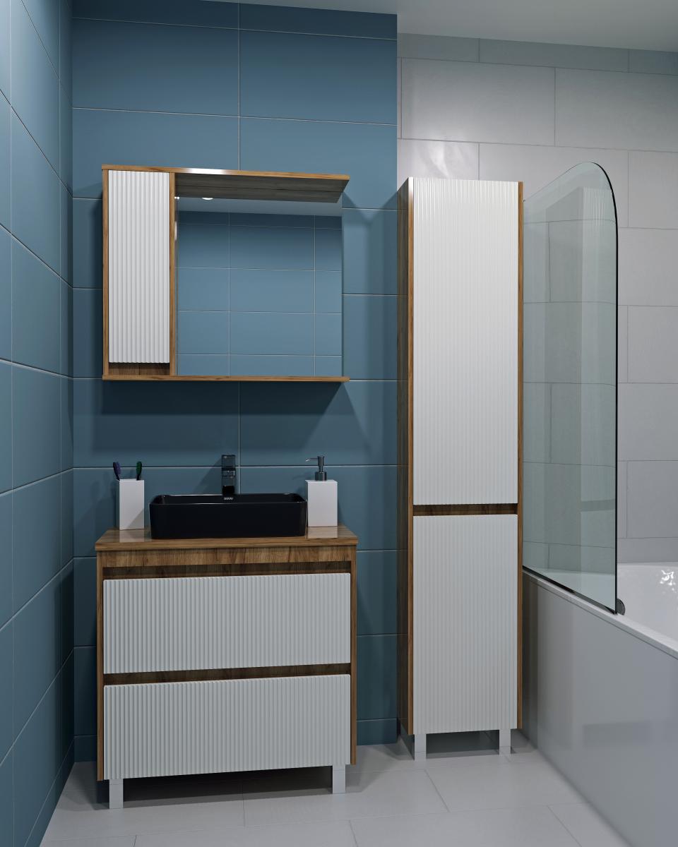 Ультрамодный элегантный дизайн коллекции мебели для ванных комнат Эвелин создан с помощью сочетания деревянной текстуры корпуса в цвете дуб крафт золото и элегантной вертикальной фрезеровки фасадов в цвете молочный глянец. Вертикальные полосы на фасадах визуально расширяют пространство, поэтому коллекция Эвелин отлично впишется даже в миниатюрную ванную комнату. Интегрированная ручка под захват на фасадах не перегружает мебель деталями, подчеркивая элегантный дизайн коллекции.